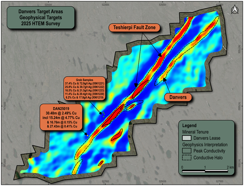 Danvers represents the most advanced discovery within the Rae Project and provides a clear pathway toward a maiden resource. The deposit hosts a historic resource of 4.16 Mt at 2.96% copper and has been materially expanded through recent drilling programs.