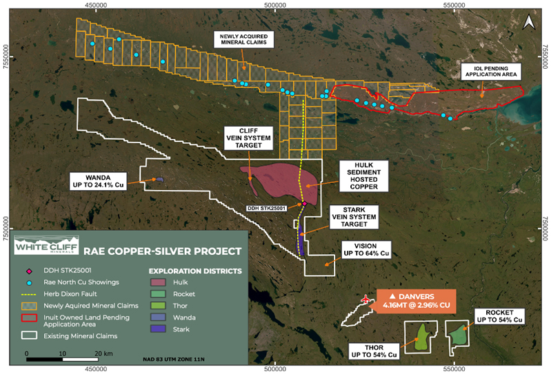 The Rae Copper Silver Project is White Cliff Minerals’ flagship Canadian asset, located on mainland Nunavut approximately 75 km from the town and deep water port of Kugluktuk. The project covers an area of approximately 2,000 km² and is situated within a highly prospective copper district that hosts multiple known copper occurrences and discoveries.